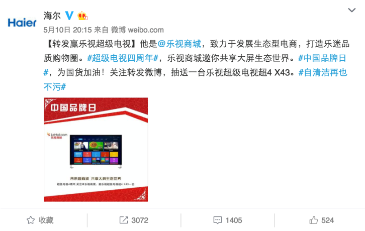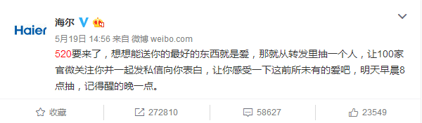 520表白日,海爾搞了一個事情,聯合60多家藍V,給一位幸運粉絲送禮物。這條轉發評論送禮物的微博在半個小時之內就轉發過萬。