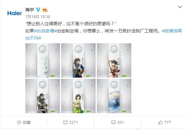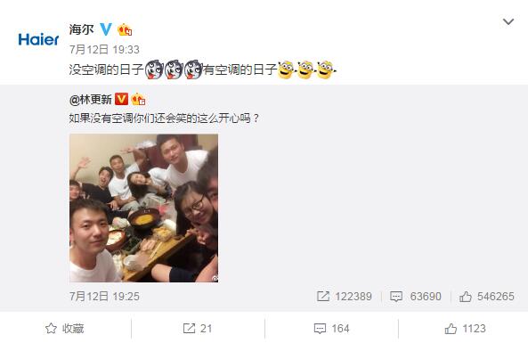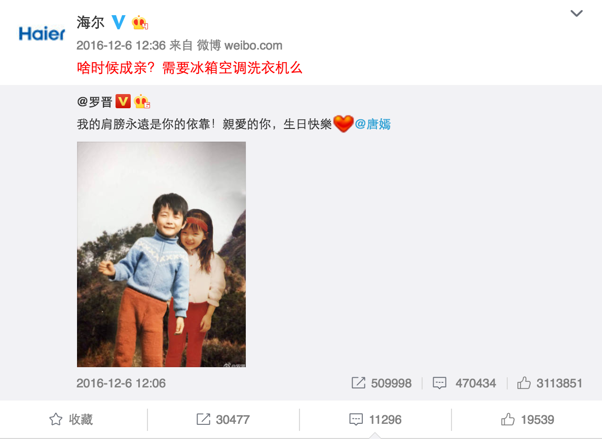 說到海爾,大家的第一印象大多都是搶熱門。比如唐嫣羅晉公布戀情時,海爾官微借勢發布微博"啥時候成親?需要冰箱空調洗衣機么"成功帶領了一眾藍V搞事情,因為這個句式很容易被模仿,所以藍V的參與度非常高。