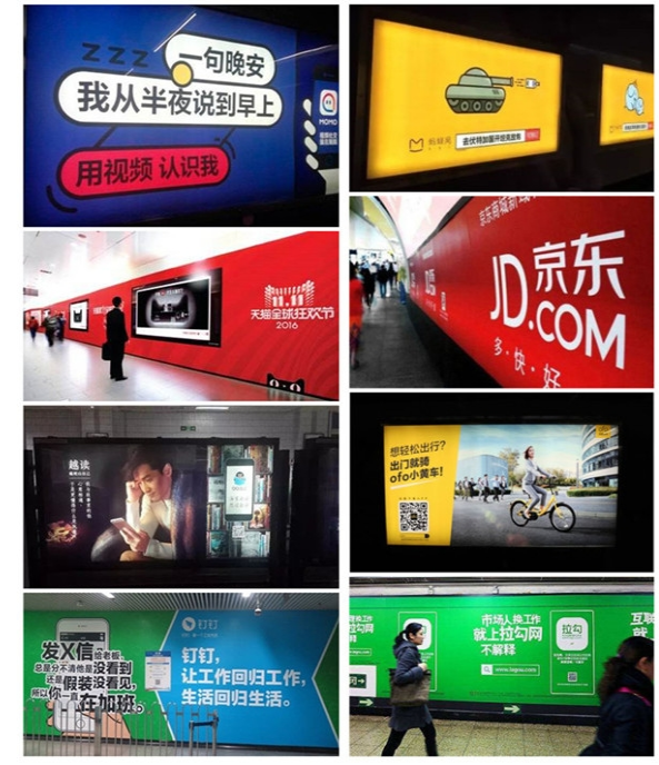 簡(jiǎn)單配色、重復(fù)表達(dá)。網(wǎng)易云音樂(lè)、知乎、陌陌、美團(tuán)、京東都用,產(chǎn)品代表色來(lái)進(jìn)行地鐵刷屏,長(zhǎng)時(shí)間內(nèi)大量重復(fù),可以讓人將品牌與顏色畫(huà)上等號(hào),進(jìn)而達(dá)到占領(lǐng)消費(fèi)者心智的目的。